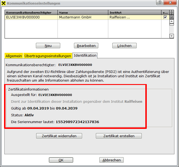 Nachdem Sie die oben ersichtliche Hinweismeldung mit der Schaltfläche „Zertifikat erstellen“ bestätigt haben, werden Sie in die „Kommunikationseinstellungen“ weitergeleitet.