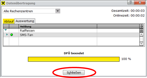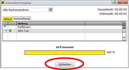 Sollten Sie eine smsTAN angefordert haben, bestätigen Sie das Fenster der Datenübertragung mit „Schließen“